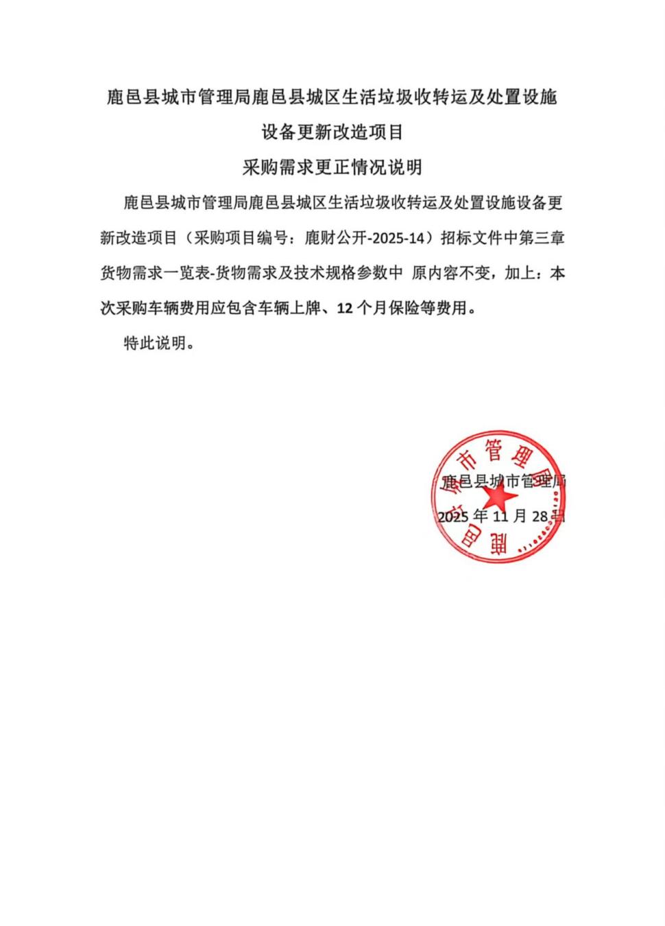 | 1、原公告的采购项目编号:鹿财公开-2025-14 |